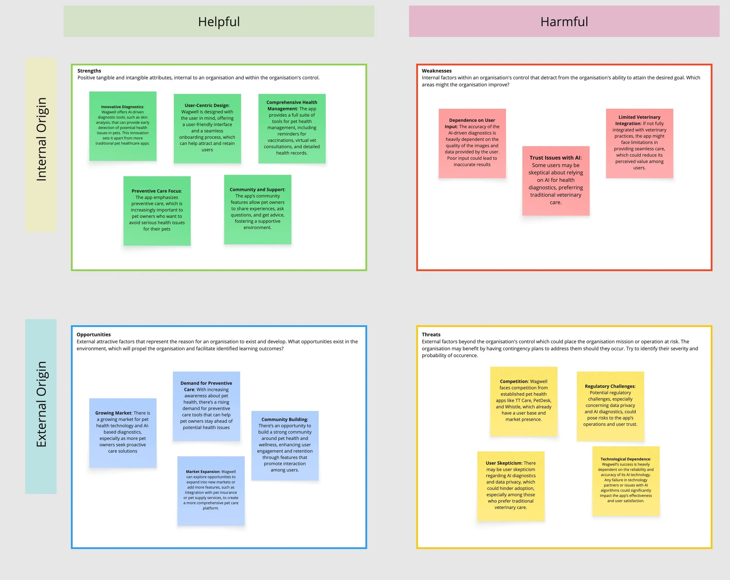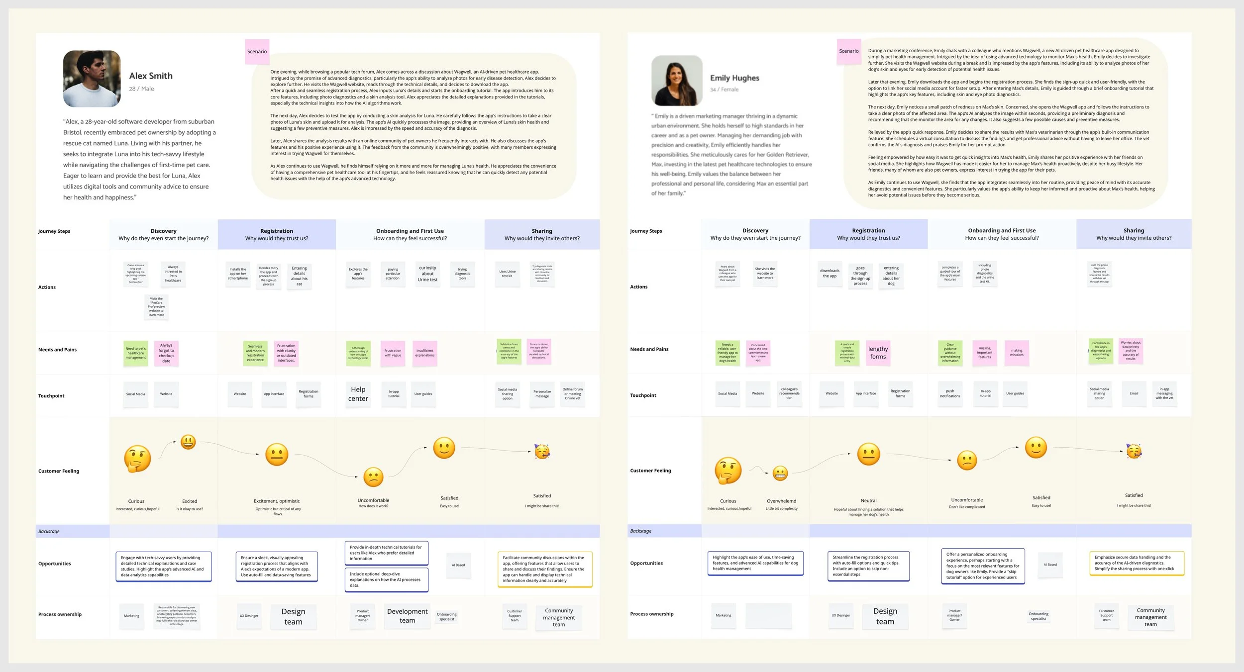 After synthesizing research findings, I defined clear user needs and problem statements through tools such as personas, empathy maps, and user journey mapping. I also developed user scenarios to explore real-life contexts and conducted competitor analysis, including SWOT evaluations, to position the solution effectively in the market.